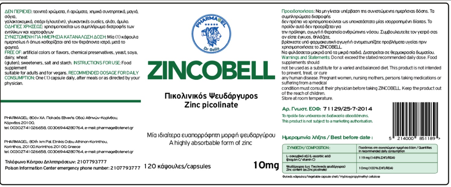 Το Zincobell είναι ένα συμπλήρωμα διατροφής το οποίο περιέχει 10 mg πικολινικού ψευδαργύρου και 119mg βιταμίνης C [L-ascorbic acid].