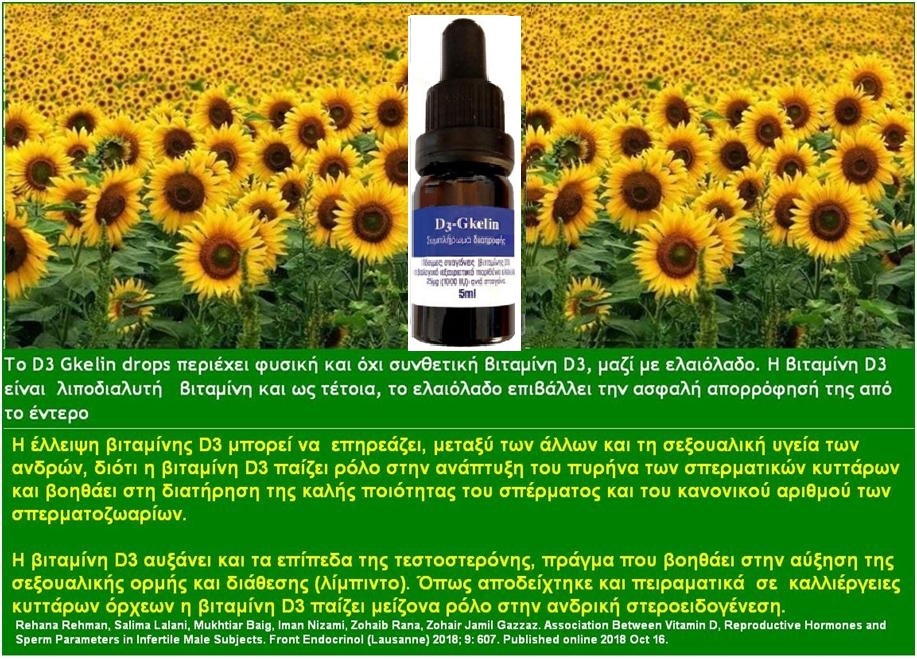 H έλλειψη αυτή επηρεάζει μεταξύ των άλλων και τη σεξουαλική υγεία των ανδρών, διότι η βιταμίνη D3 παίζει ρόλο στην ανάπτυξη του πυρήνα των σπερματικών κυττάρων και βοηθάει στη διατήρηση της καλής ποιότητας του σπέρματος και του κανονικού αριθμού των σπερματοζωαρίων.